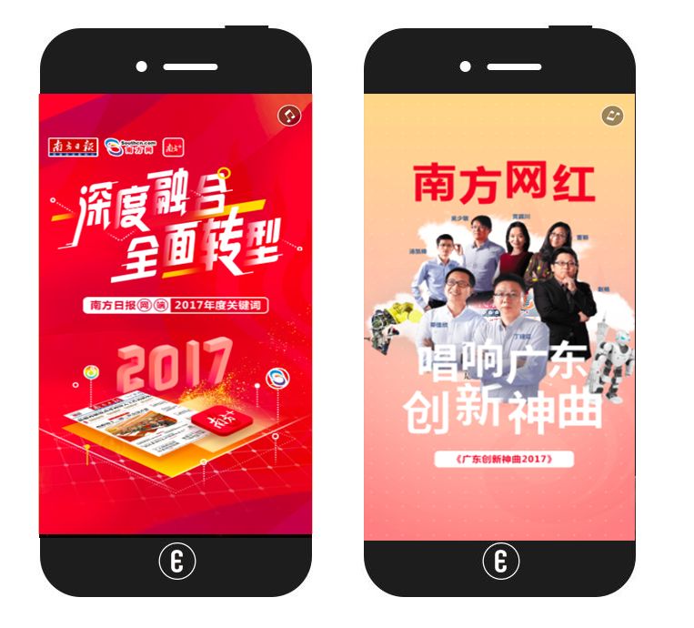 近年来,随着《王小艺朋友圈》、《穿上军装》等 H5 的走红,许多媒体机构也开始关注和留言用 H5 技术来进行新媒体的传播。这是南方日报的新年年终总结 H5 ,巧妙的将快闪形式以及一镜到底结合起来,总结了过去一年中,南方日报所参与的诸多重大新闻事件。