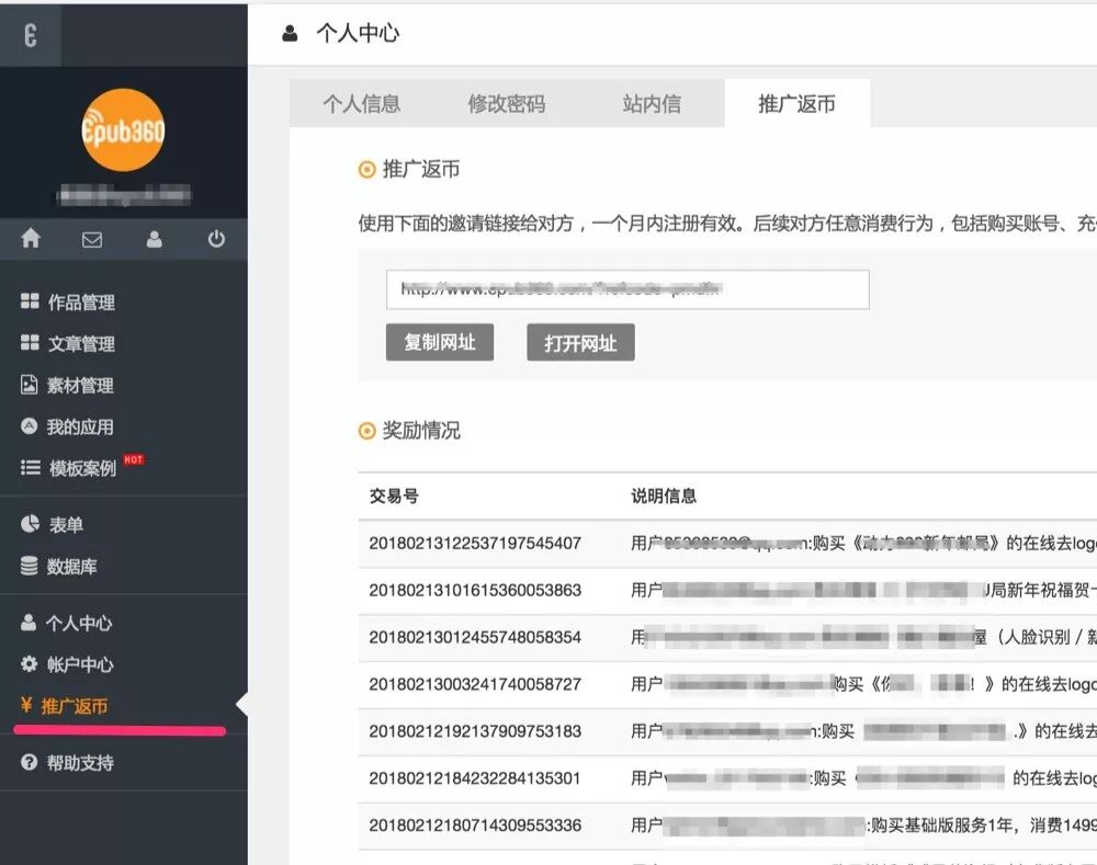 第一步:工作台左侧菜单,点击打开“推广返币”页面,点击“推广返币”,可获取邀请网址,并查看奖励情况。