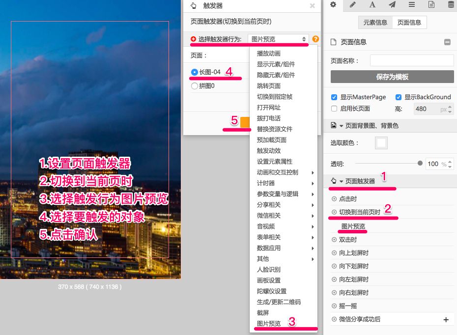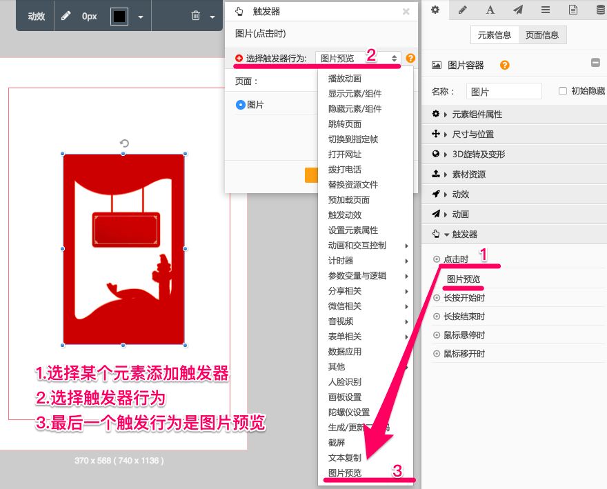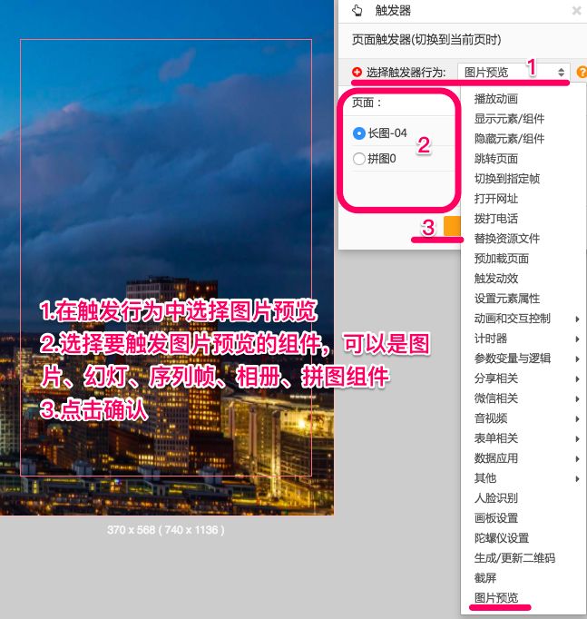 图片预览触发器可选择图片组件、幻灯、序列帧、拼图、相册组件进行图片预览