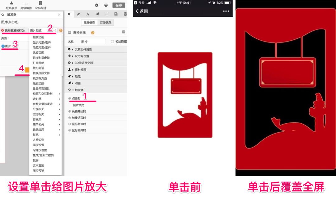 如给单张图片元素设置触发器——点击时,可触发幻灯组件内首张图片,弹出全屏显示,并在该全屏模式下,可连续滑动查看下一张。