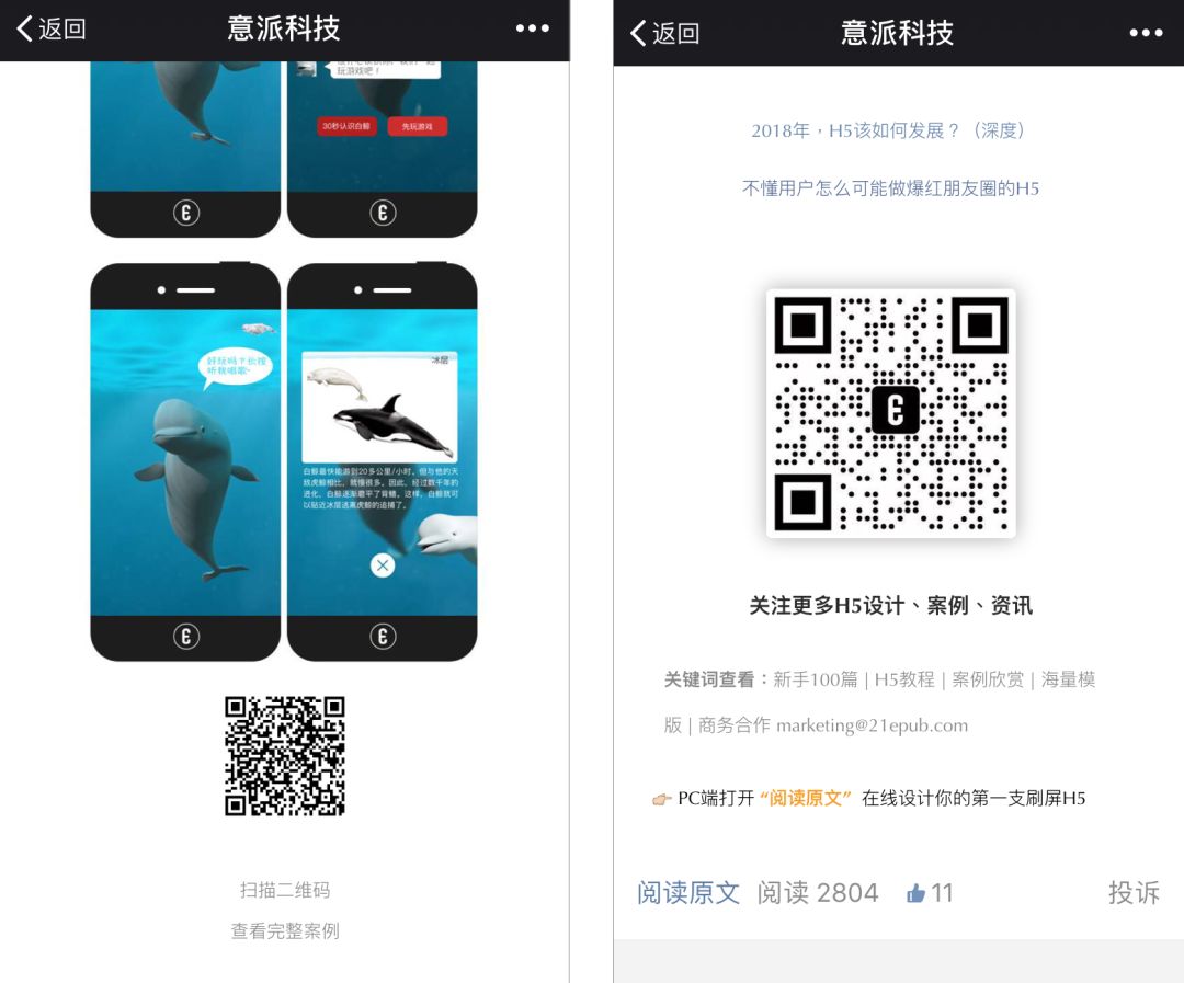 在微信文章中插入作品二维码,通过长按识别二维 H5 作品,或在文末【阅读原文】里放入 H5 链接,点击后进行转发分享。