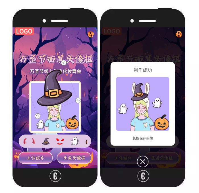 玩法介绍:用户可先选择头像图片(该H5模板可自动获取用户的微信头像图片,同时,也支持用户自行上传喜欢的图片),再用喜欢的元素(元素支持缩放、拖拽、旋转、移除)装饰头像,继而通过提示按钮合成一份新头像。