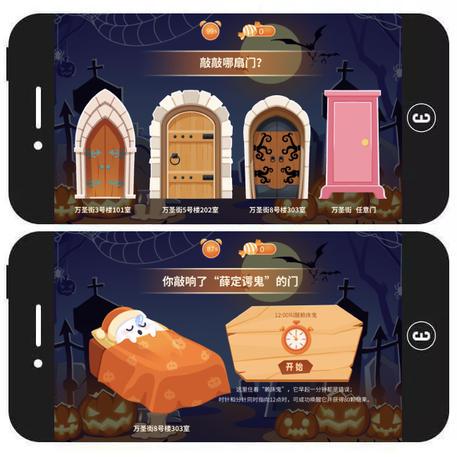 ③【万圣街8号楼303室】即“薛定谔鬼”的门,里面可能是空房间,也可能住着“赖床鬼”。若遇到“赖床鬼”,用户需参与叫醒赖床鬼的游戏,即当时针和分针同时指向12点时,点击“唤醒”按钮。若成功唤醒,用户可获得80颗糖果;
