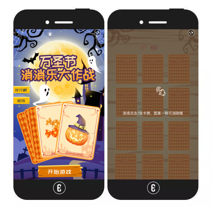 玩法介绍:该H5模板以万圣节敲门要糖果为创意切入点。作品共设置了4扇门,用户需在100s内选择不同的门,从而迎接不一样的惊喜/惊吓,并收集100颗万圣糖果。