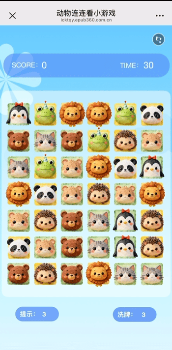 玩法简介:玩家可通过点击操作将相同的动物图案消除,而界面底部的“提示”及“洗牌”按钮则可辅助玩家更快通关。倒计时结束后,玩家还可查看得分及排行榜。
