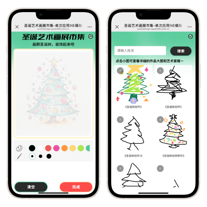 玩法介绍:模板首页包含“查看市集”及“开始创作”两个按钮。点击“查看市集”,用户可浏览其他人指绘的圣诞树(支持点击查看大图、按作品名称检索);点击“开始创作”,用户可选择颜色及画笔粗细,进而指绘一幅圣诞树,并输入作品名称。作品创作完成后,用户可公开到市集或生成海报。