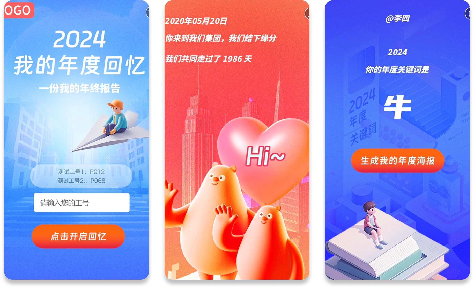 案例说明: 该员工 2024 年度报告 H5 以职场成长叙事为核心,通过工号专属定制的形式,整合员工入职时长、月度工作峰值(如建立 22 个 H5 项目群)、获奖荣誉等职场行为细节,搭配 “忙到飞起”“能力让团队增辉” 等接地气文案,最后生成 “牛” 等年度关键词海报。以 3D 插画营造的职场场景为视觉载体,既实现了员工年度工作轨迹的个性化呈现,又强化了企业与员工的情感联结, 定制化的人物画像和强烈的荣誉感,有助于企业文化建设和内部激励。