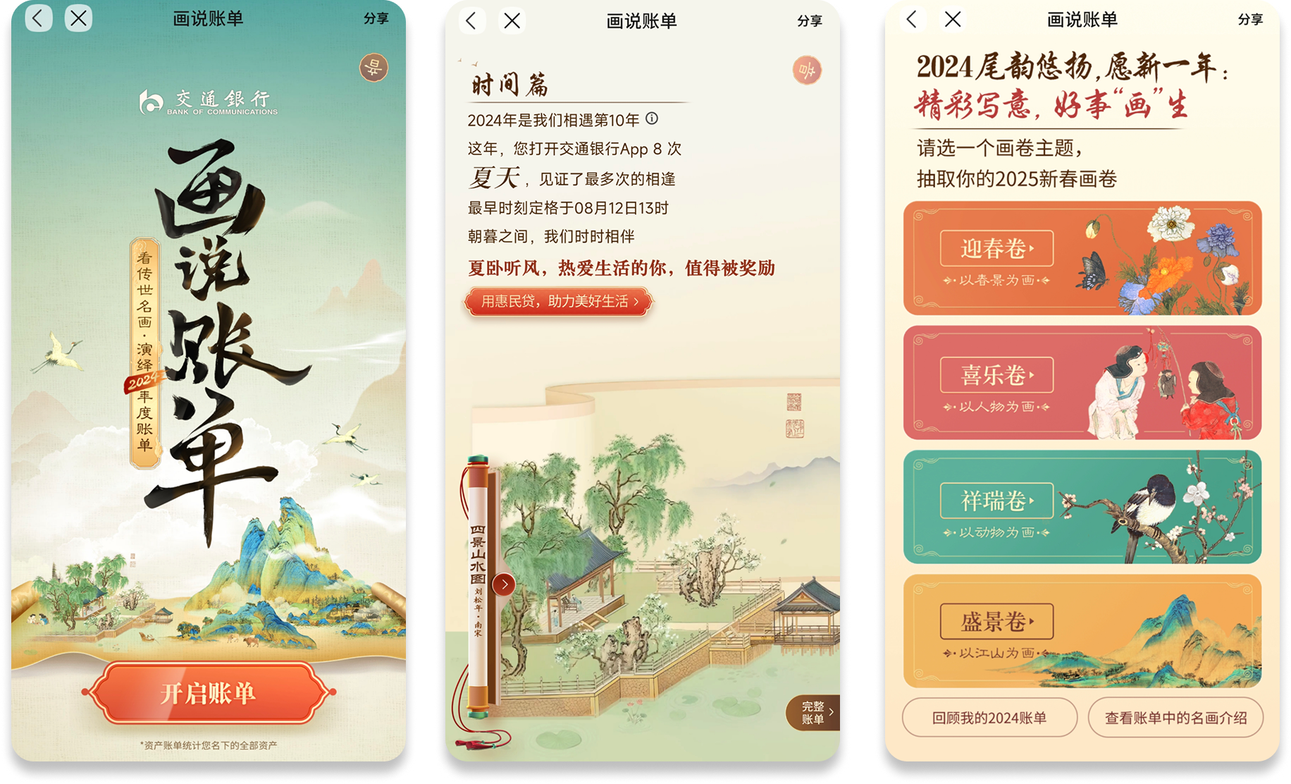 案例说明:以传世名画为创意载体,将用户2024年度金融数据与《千里江山图》《清明上河图》《五牛图》等经典画作深度融合,从时间、资产、收支等维度,用国风画境演绎账单数据。同时设置新春画卷抽取环节,在呈现金融服务数据的同时,传递传统文化韵味,实现了金融服务与文化传播的创意联动,为用户打造出兼具数据价值与审美体验的年度账单交互场景。精准的个人数据和专业的视觉呈现,满足用户对自身消费习惯的好奇心和管理需求。
