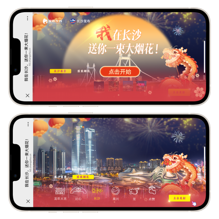 内容简介:用户可先选择场景和烟花样式,再通过“点击发射”按钮在线燃放烟花。此外,用户还可根据提示获得一份相应的合成海报。