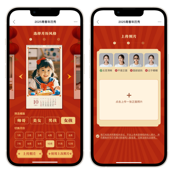 内容简介:用户只需选择喜欢的模板及月份,并上传符合标准的正面照,即可生成个性化的复古月历海报。海报中包含一份AI人脸融合照,及用户所选月份的月历。当用户想要再次生成其他月份或样式的月历时,可选择直接使用上次的照片,无需重复上传。