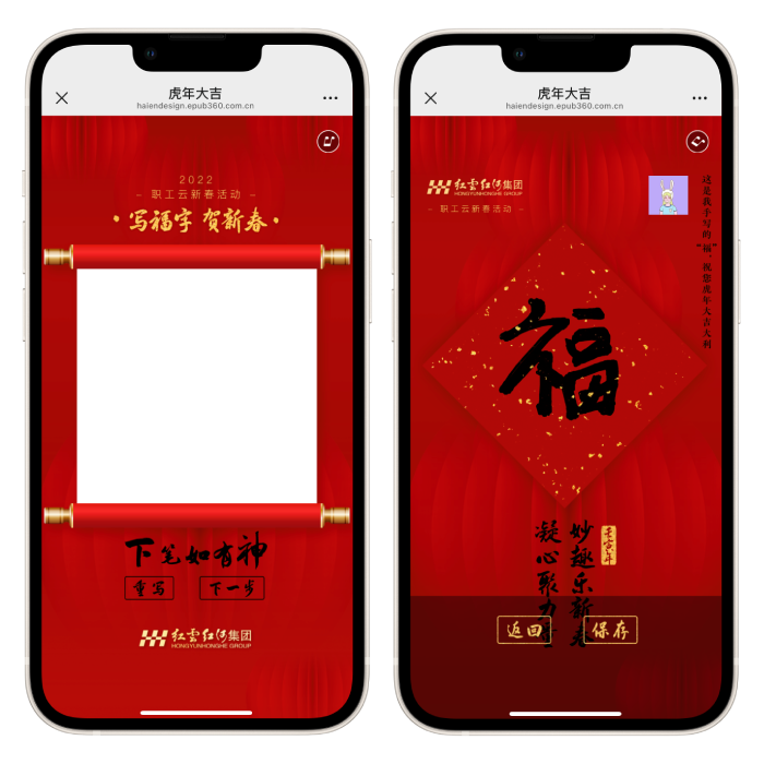 内容简介:用户可先手写“福”字,再通过提示按钮生成一份带有自己微信头像的专属“福”字海报,海报可通过长按操作保存至手机。