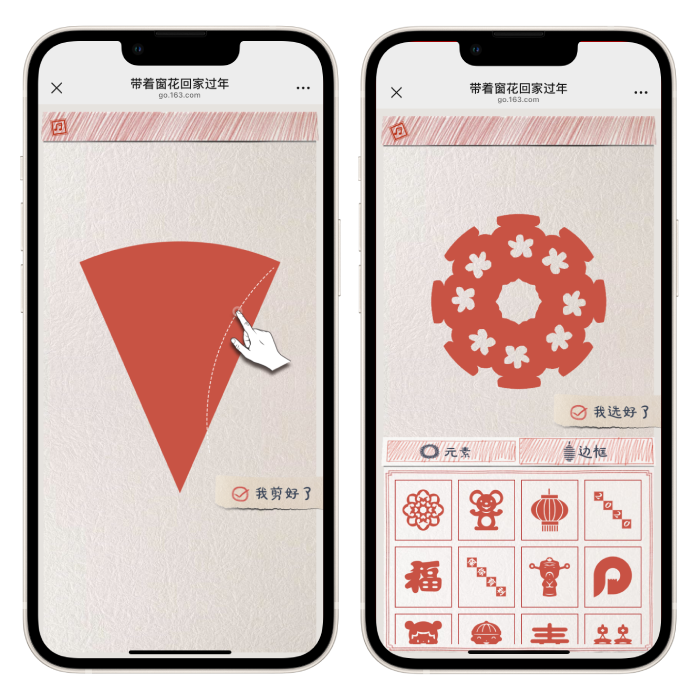 内容简介:用户可先浏览一段动画,再根据提示参与在线剪窗花互动。互动环节分三步,首先,用户可通过滑动屏幕的方式裁切红纸;其次,用户可选择喜欢的元素及边框;最后,用户可选择背景样式,并生成一份专属海报,海报生成页下方的提示按钮可指引用户再玩一次,或前往相应的公众号文章。