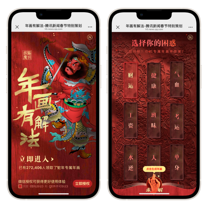 内容简介:用户可先观看一段视频,再从12个选项中选出自己的困惑,继而查看一份承载着个人心愿与美好祝愿的年画。此外,用户还可根据提示保存年画、壁纸,或跳转网页。