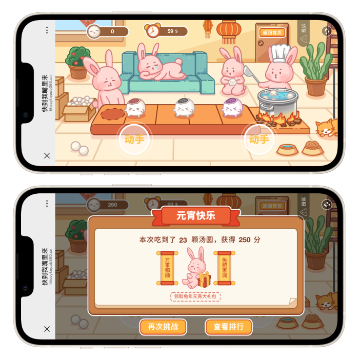 玩法介绍:该模板需用户手眼协调配合,游戏的设定基于一家制作汤圆的兔子工厂,汤圆在传送带上运输,当到达指定范围内时,用户可通过“动手”按钮帮助兔子偷吃汤圆,汤圆的类型不同,得分也就不同。60s倒计时结束后,用户可查看游戏结果,并根据提示按钮再次挑战、查看排行榜或跳转网页。
