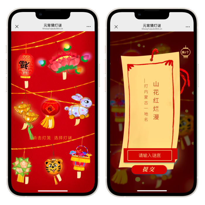 玩法介绍:该模板共包含8个灯笼,每个灯笼对应一道灯谜。用户可先通过点击操作任选一个灯笼,再浏览谜面、输入谜底并提交。