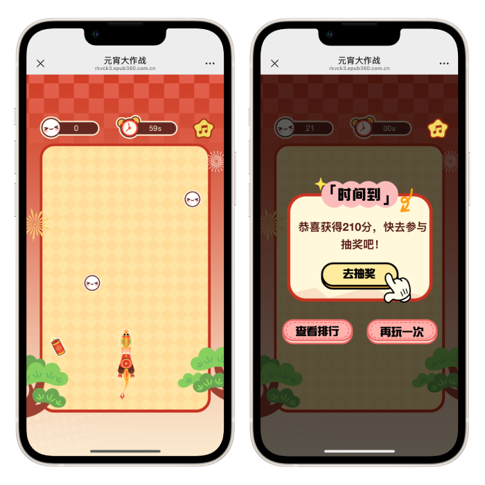 玩法介绍:该模板需用户在60s内通过拖拽操作控制插画人物自由移动,从而接住元宵(每接住一个,可得十分),并躲避鞭炮(若触碰到鞭炮,则游戏结束)。若闯关成功,用户可根据提示按钮查看排行榜、参与抽奖或再玩一次。若闯关失败,用户可继续挑战(每人每日3次参与机会)。