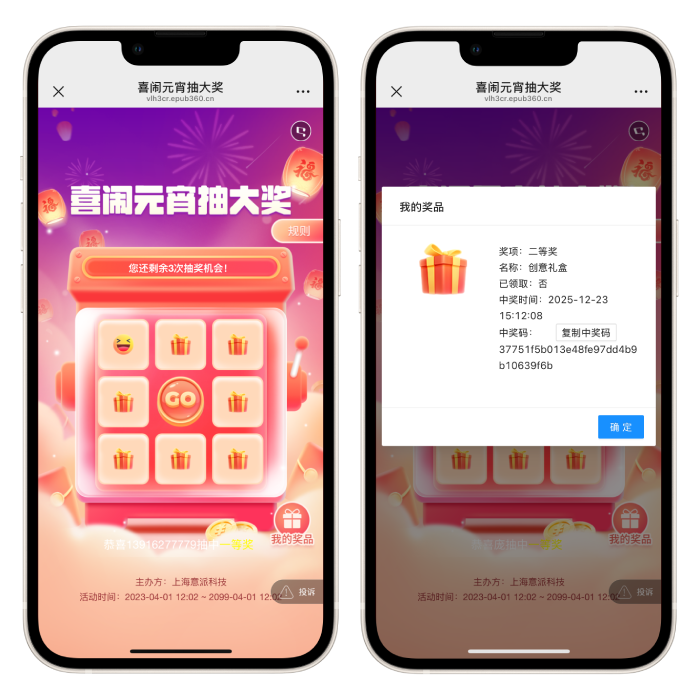 玩法介绍:该模板可通过九宫格抽奖的方式助力品牌商家开展线上抽奖活动,用户可通过提示按钮参与抽奖、查看奖品、复制中奖码。