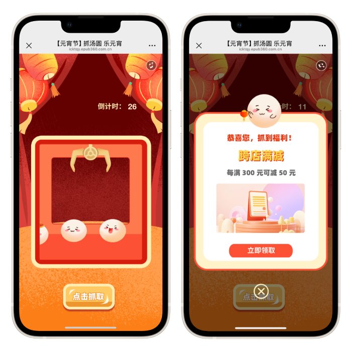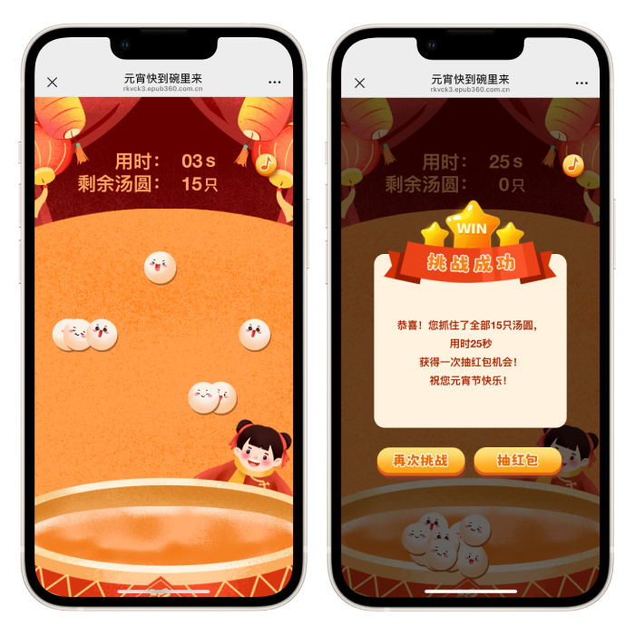 玩法介绍:该模板需用户通过拖拽操作将飞奔而过的15只元宵放到碗里,挑战成功后,用户可查看用时、再次挑战(排行榜只记录最高成绩,用时越短,排名越高),并参与抽红包活动。