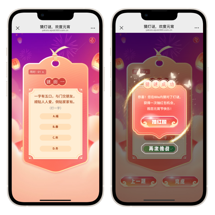 玩法介绍:该模板共包含5道谜题,每题可多次作答,只有答对后,方可继续下一题。若在60s内顺利通关(每人每日5次参与机会),用户可根据提示参与红包抽奖或再次挑战。同系列模板:《猜灯谜,喜迎新春》