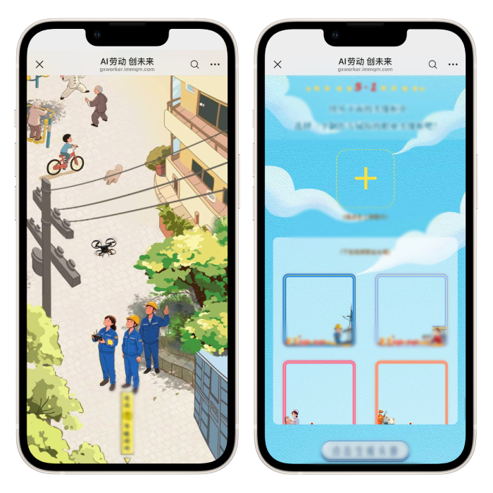 内容简介:用户可先浏览一段动画视频,再进入插画长页,继而根据提示查看各种场景中的人物对话,并通过相关图文、视频及趣味交互,了解全国劳动模范的相关介绍、见证科技如何为劳动者赋能。作品最后,用户还可上传照片、选择头像框、生成专属职业头像。