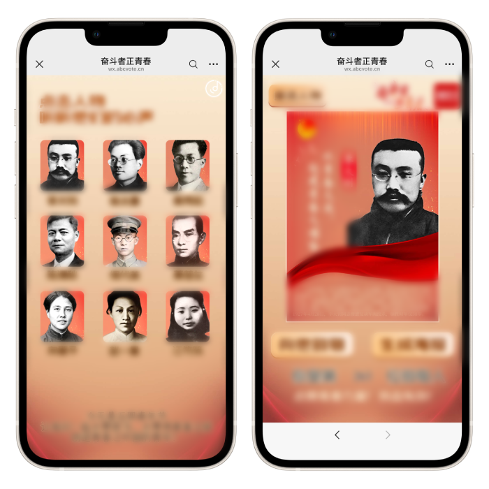 内容简介:该H5旨在带领用户向革命先烈致敬。用户可先根据提示选择一位人物(共9位人物可选),继而浏览相应的介绍海报、查看自己是第几位致敬人,并生成一份专属的致敬海报。
